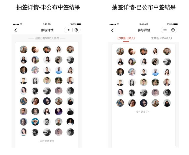 6. 抽签模式售卖的商品的详情页会以微信头像的形式展示所有参与及中签人群,活动公平透明,参与及中签一目了然