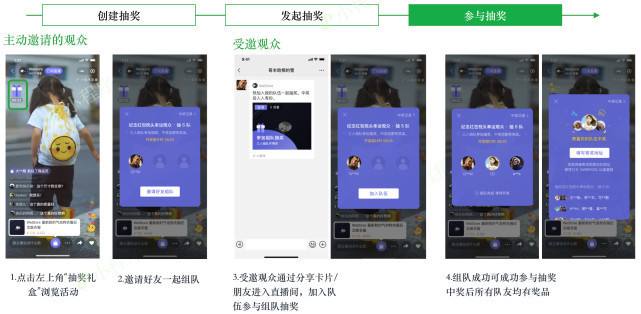 (1)组队抽奖可以帮助商户在微信环境下裂变拓客,用户邀请好友达到指定人数后,在直播间抽奖